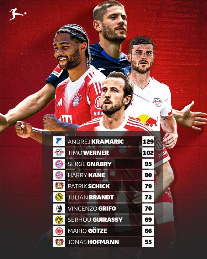 现德甲进球数前10球员:克拉马里奇129球第1,凯恩80球第4相关内容